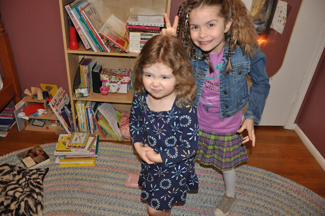 Today was Crazy Hair Day at the elementary school. Basically you come to school with a dollar for charity and some crazy hair. It's somebody's crazy hair-brained idea to make a buck.... (HA! I kill me). We opted for a multiple braids with ribbons braided into the hair for more craziness! I wasn't completely happy with the bad parting I had started off with on the left side of her head so, in the morning my mild OCD hinted to me that it must be corrected. With all that wave from being braided overnight I just had to do something with it and so we put two frizzy pony tails into the mix. It was pretty darn crazy I tell ya. By the time we put together a crazyish outfit for Big Girl she was doing her hip-pop pose in the full-length mirror and I noticed her little sister getting a bit crazy with jealousy. Suddenly her outfit wasn't nearly good enough and her own hair was "ugly!" She pouted and whined all through breakfast and eventually got sent to her room so we could give our ears a rest.